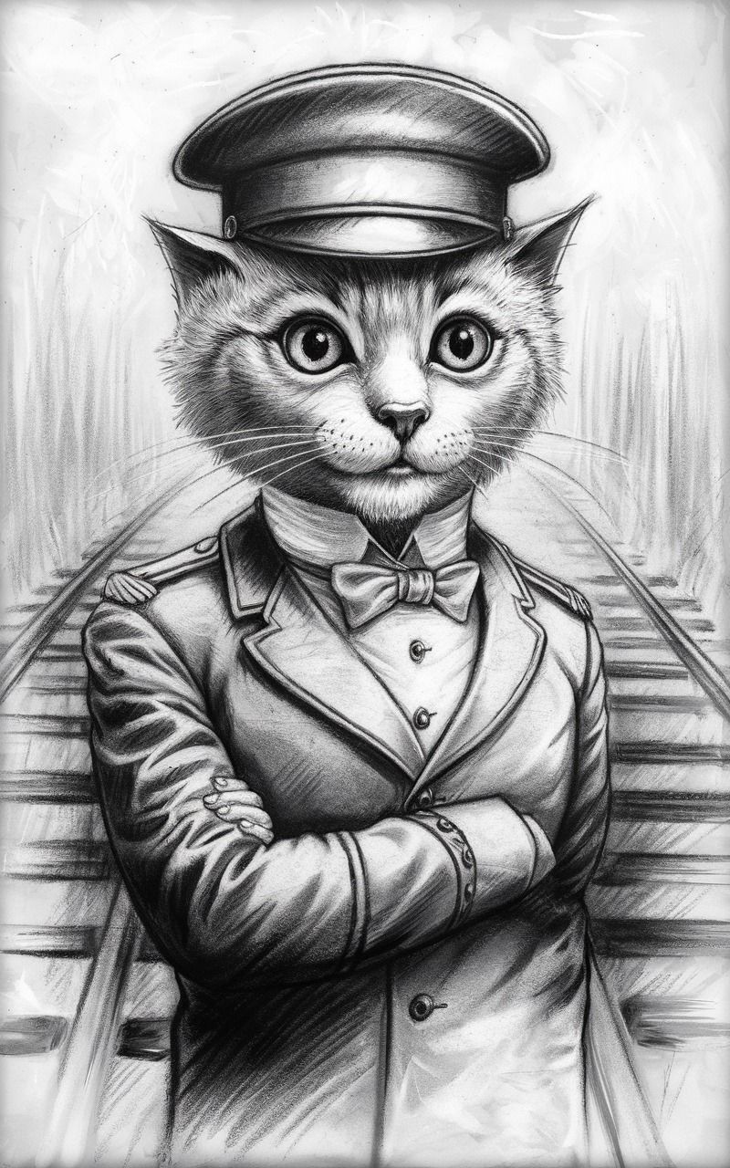 "A whimsical yet realistic charcoal drawing in the style of Caruso: a wide-eyed feline train conductor standing proudly in uniform, brimmed hat slightly tilted. Bold, confident charcoal strokes outline the jacket and cap, while the fur is rendered in soft hatching for depth. Subtle smudges create a hazy backdrop of train tracks disappearing into the distance. Strong highlights in the eyes give a sense of alertness and charm."Try this prompt in any decent AI image generator and let me know your result.