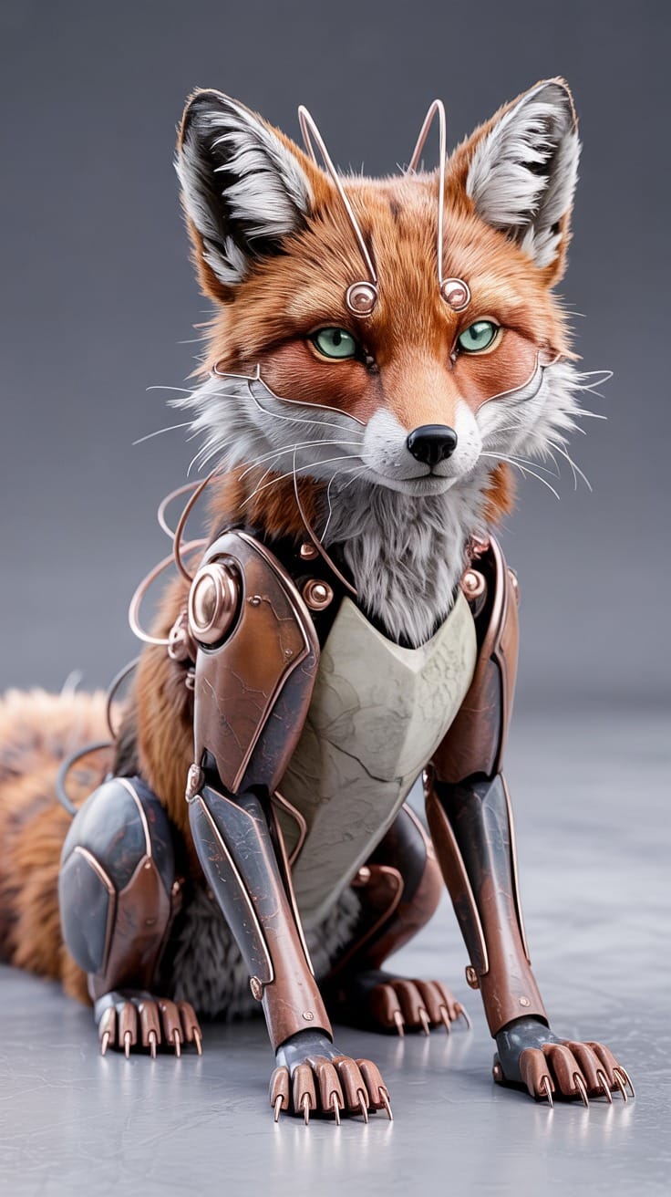 "Hyper-detailed close-up of a seated cybernetic fox with russet and white jasper plating, articulated limbs, and a copper wire tail. Features sharpened citrine claws and emerald sensor eyes. Clean studio lighting with a neutral background, emphasizing plush fur textures and warm metal mechanics. Intricate wirework, biomechanical design, Octane render, C4D, stylize 250."Try this prompt in any decent AI image generator and let me know your result.