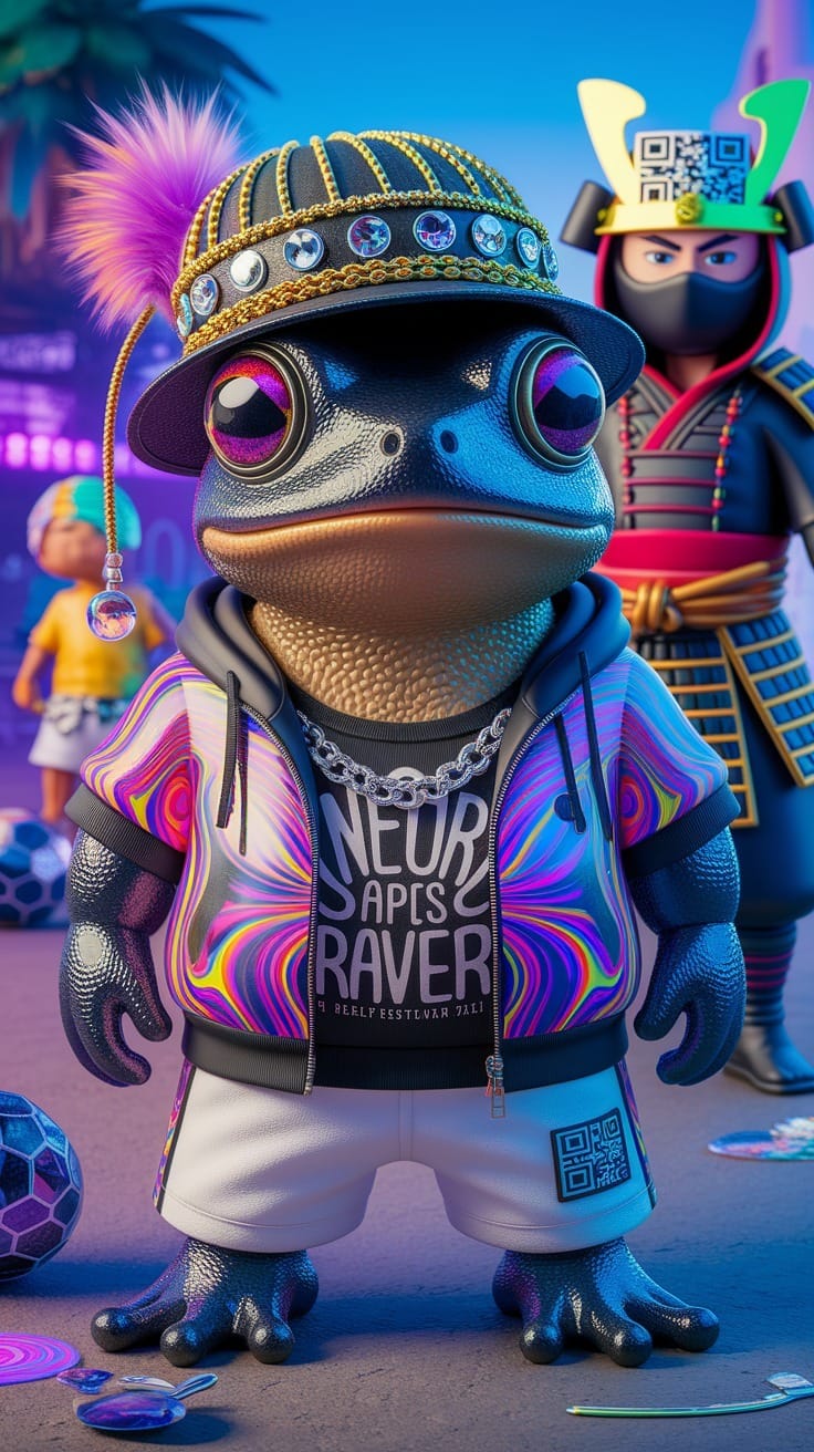 "A full-body portrait of a toad crafted from a 3D black and sapphire crystal, adorned with a psychedelic light neon optical illusion pattern, stands out in a vibrant festival setting. The toad wears streetwear typical of a raver, complete with a kawaii hat featuring crystal embellishments, hemp, and gold-black chains. In the background, a ninja figure dons a QR code Samurai helmet and traditional folk attire, adding an enchanting layer to this captivating fashion magazine spread. The image, rendered in a stunning 3D style, exudes warmth and color, drawing the viewer into its magical world."Try this prompt in any decent AI image generator and let me know your result.