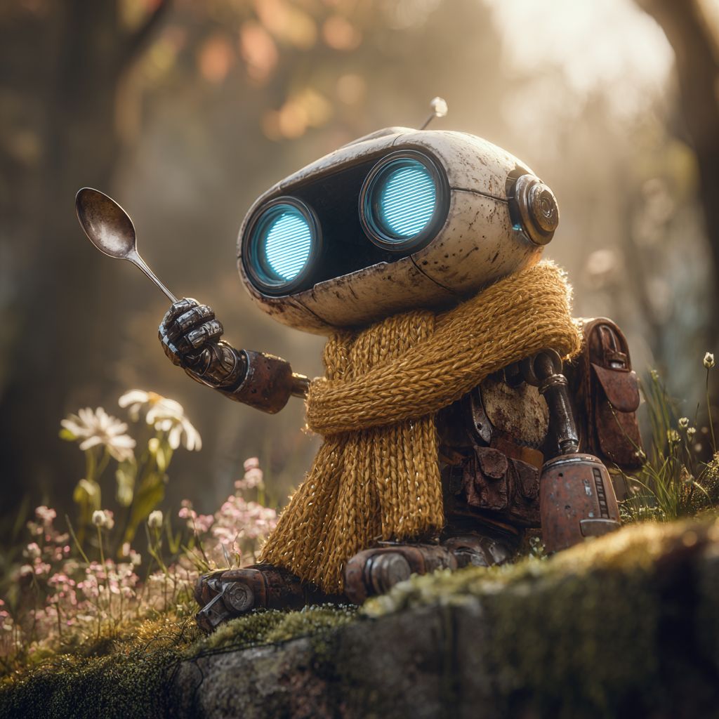 "A candid close up of a small, endearing robot explorer with large round eyes glowing soft blue. It wears an oversized mustard yellow knitted scarf and a worn leather backpack. Tilting its head, it offers a rusty bent spoon toward the camera. The robot sits among moss covered rubble and wildflowers in a sunlit ruin, bathed in warm golden hour light with gentle textures."Try this prompt in any decent AI image generator and let me know your result.