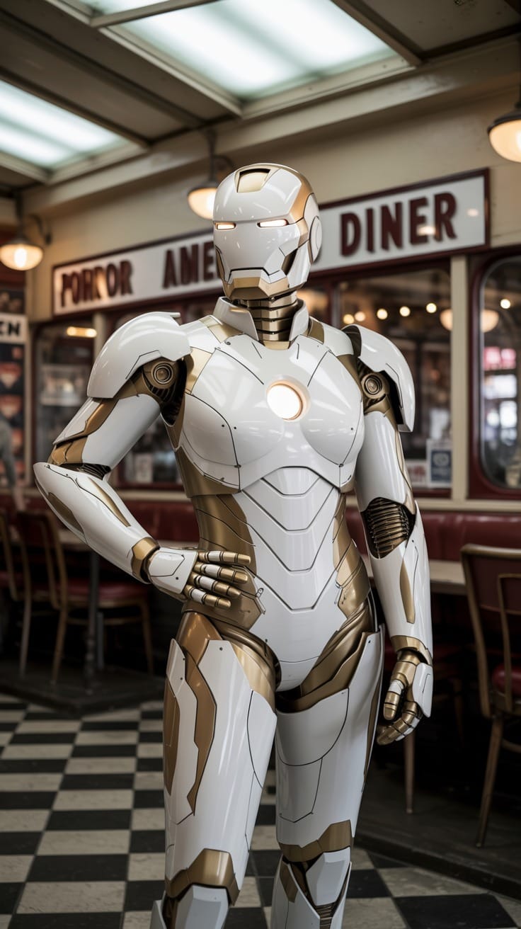 "A Norman Rockwell–style photograph of a feminine Iron Man in white and gold armor, featuring elegant curves and a streamlined helmet. She strikes a confident, heroic pose with one hand on her hip inside a vintage American diner with checkered floors and retro signage, bathed in soft, nostalgic lighting."Try this prompt in any decent AI image generator and let me know your result.