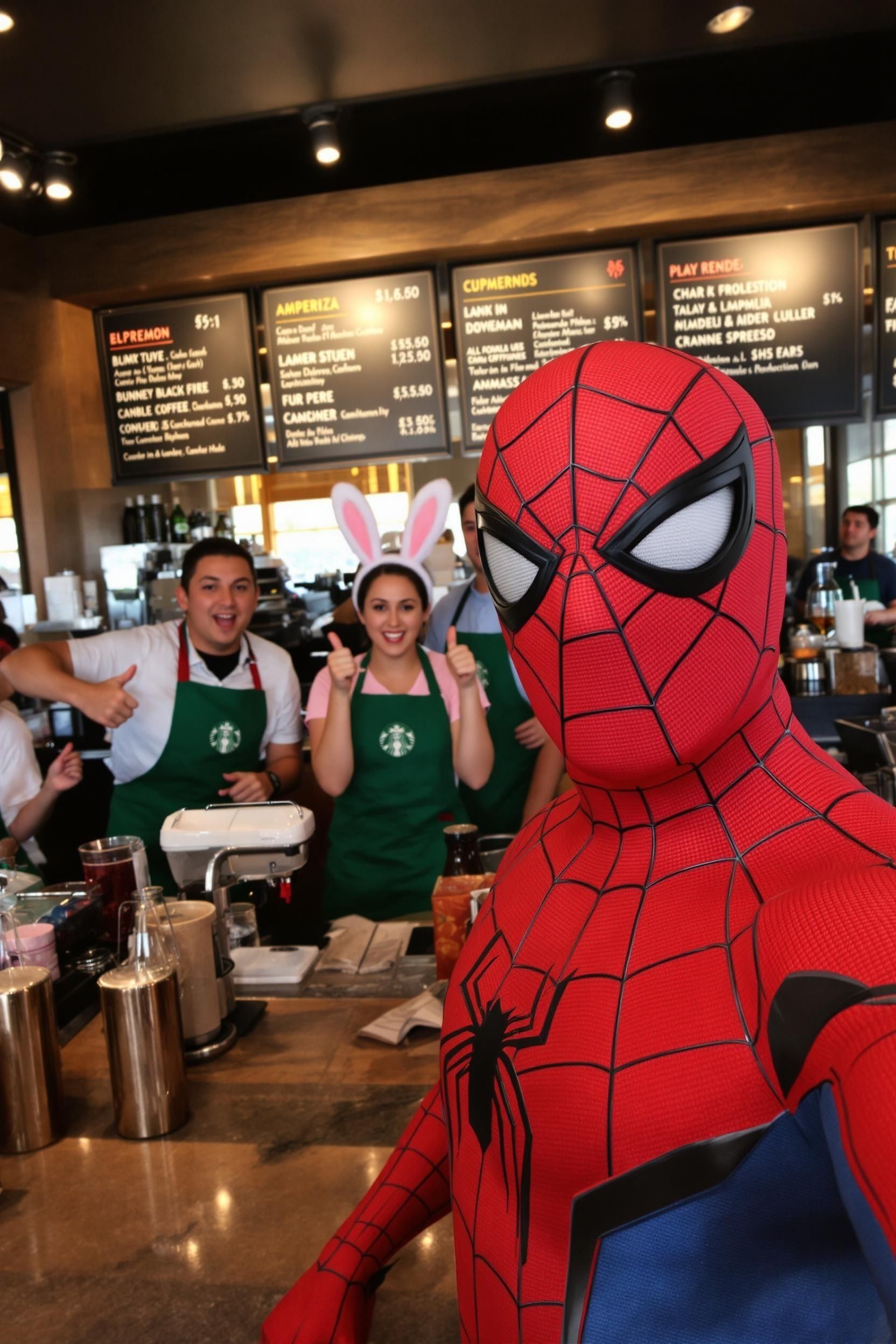 "Spider-Man taking a selfie inside a Starbucks. His gloved hand is reaching toward the camera in classic selfie pose. In the background, baristas in green aprons are smiling and going about their work behind the counter. Warm cafe lighting, coffee machines and menu boards visible in the background."Try this prompt in any decent AI image generator and let me know your result.