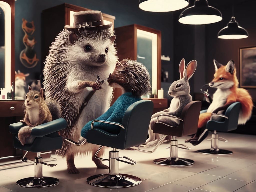 "Cinematic 3D render of a stylish hedgehog hairstylist working on woodland animals in a modern, glowing salon. The hedgehog wears a fashionable hat and holds scissors while a squirrel, rabbit, and fox sit in sleek chairs. The scene has a painting-like atmosphere that blends high end wildlife charm with contemporary design."Try this prompt in any decent AI image generator and let me know your result.