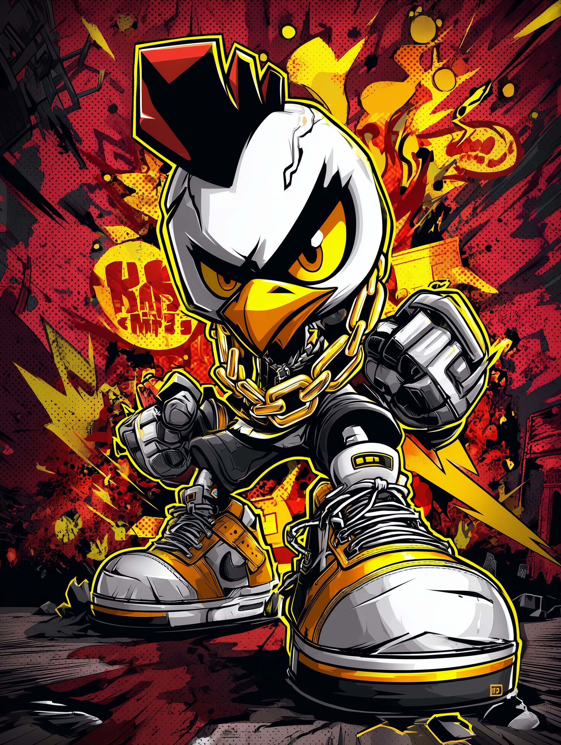 "New school graffiti illustration of a chibi chicken mascot with a sharp beak grin, exaggerated eyes, cracked puffed body, streetwear sneakers, and heavy gold chain in an explosive pose. Thick black outlines, neon yellow accents, red-yellow-black palette, halftone shading, dripping spray paint, and smoke clouds. Grunge wall background with a chicken and rooster in motion blur. Bold t-shirt print layout."Try this prompt in any decent AI image generator and let me know your result.