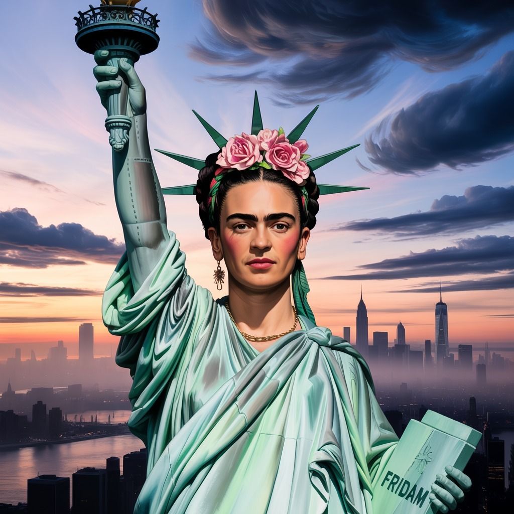 "A surreal digital painting of Frida Kahlo’s face seamlessly merged with the Statue of Liberty. Her iconic unibrow, floral headdress, and melancholic gaze contrast with the statue’s classical form. A hazy New York City skyline fades into a twilight sky with swirling clouds, while the word “fridam” is subtly inscribed on the statue’s tablet. Soft, ethereal lighting highlights Frida’s face, blending cultural symbolism with dreamlike artistry."Try this prompt in any decent AI image generator and let me know your result.