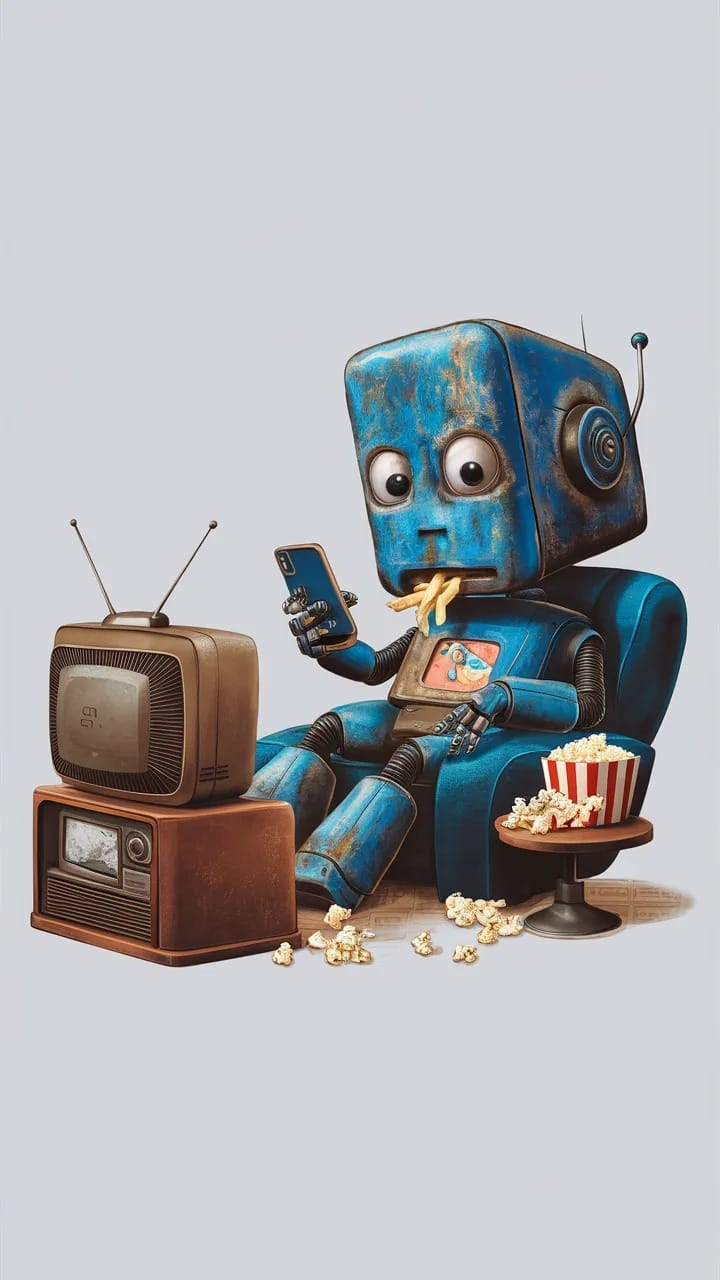 "A striking digital art piece featuring a chunky, blue rusted robot with a squared head, slouched lazily in a worn couch in front of a glowing TV. He is fully zoned out on his smartphone, ignoring everything around him. A small table nearby holds french fries and scattered popcorn. The scene captures the essence of modern sedentary life, making it both eye-catching and thought-provoking."Try this prompt in any decent AI image generator and let me know your result.