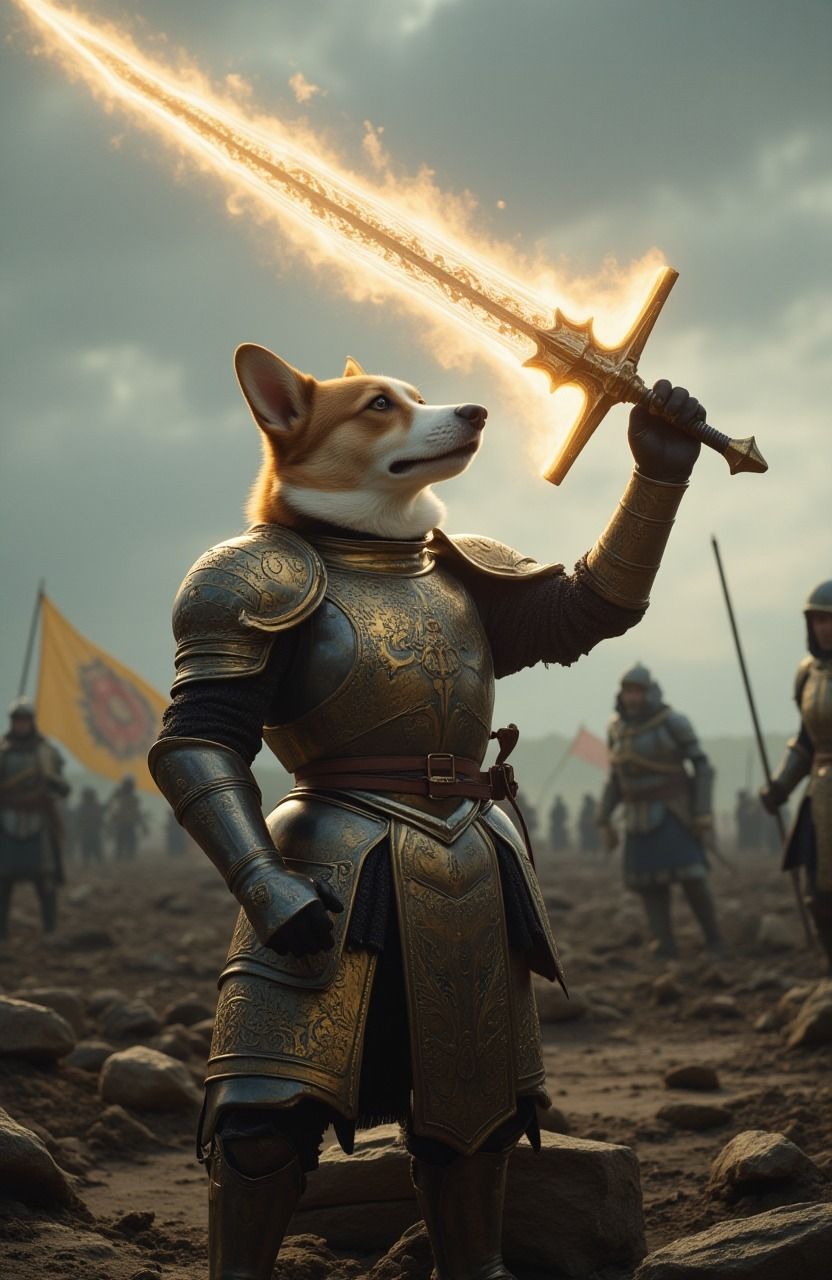 "A valiant humanoid corgi, clad in ornate, heavy-plated armor with golden engravings and divine sigils, stands resolute on a war-torn battlefield. His fluffy fur peeks through the polished gaps, contrasting with the hardened steel. Raising a radiant sword pulsing with holy light, he becomes a beacon of hope amidst the gloom. Behind him, loyal warriors stand ready, their armor battle-worn but their spirits unbroken. The battlefield stretches into the misty horizon, littered with broken weapons and tattered banners, while his divine radiance pierces the heavy gray sky."Try this prompt in any decent AI image generator and let me know your result.