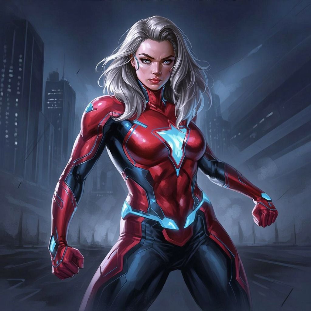 "A digital painting of a female superhero in a dynamic medium shot. She possesses an incredibly strong and determined gaze, radiating immense power and unwavering resolve. Dressed in a sleek, futuristic bodysuit of deep crimson and electric blue, it features streamlined contours and subtle glowing accents, reflecting her advanced capabilities. The background is a blurred cityscape at night, emphasizing her heroic presence amidst an urban landscape ready for her defense."Try this prompt in any decent AI image generator and let me know your result.