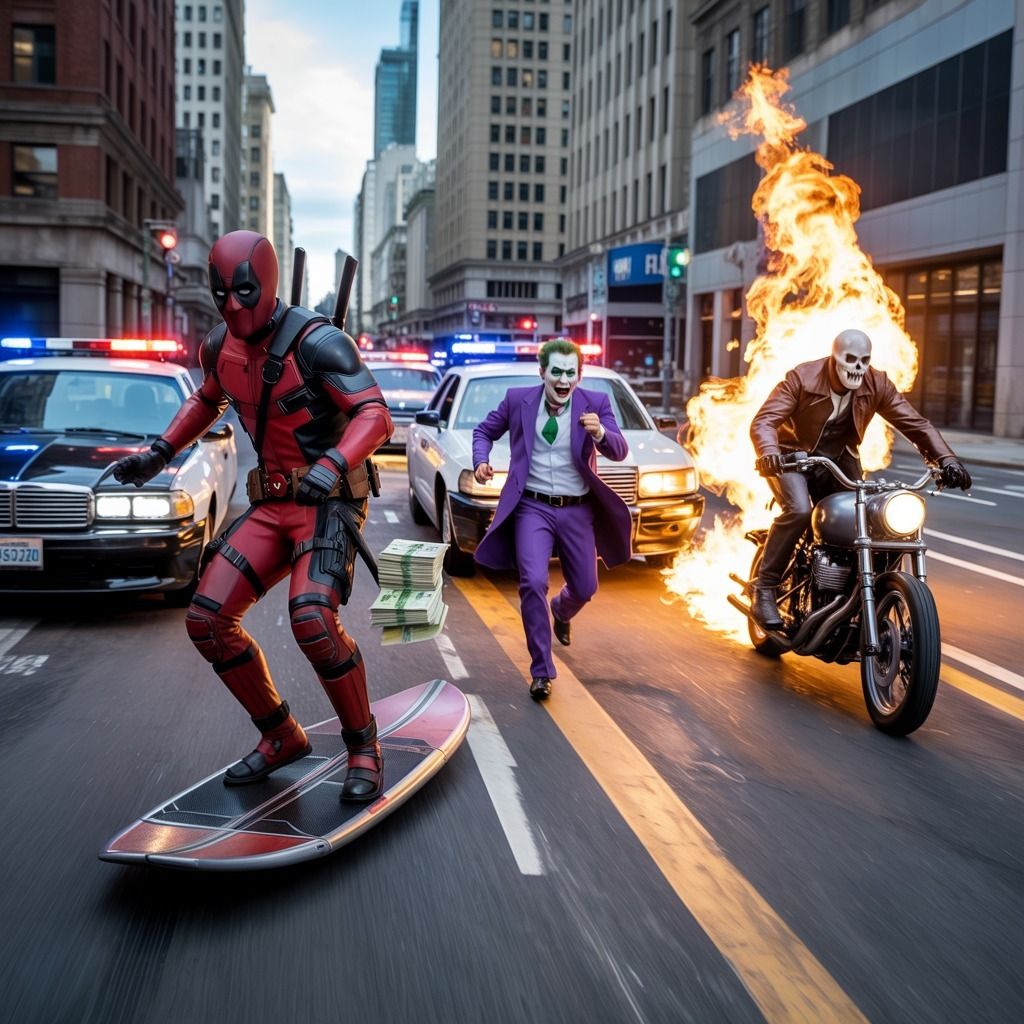 "Hyper-realistic cinematic scene of Deadpool surfing on a metallic board through city streets, clutching cash as police cars chase him. The Joker runs frantically in the middle ground, unnoticed by police. Ghost Rider emerges from a bank on a flaming motorcycle, hellfire trailing behind. Dynamic motion blur, realistic lighting from police spotlights and flames, and gritty urban textures emphasize the chaotic action."Try this prompt in any decent AI image generator and let me know your result.