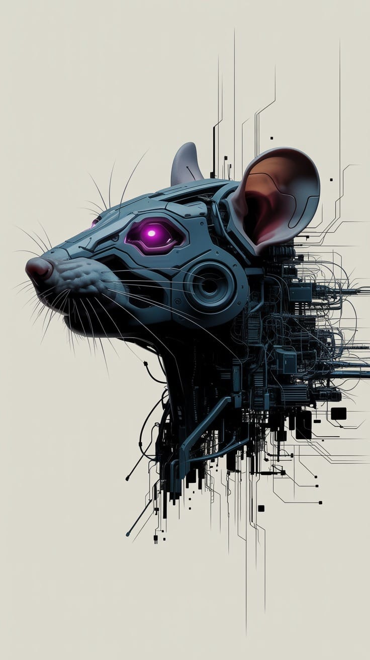 "Cyberpunk rat head profile in tech-noir style, featuring dark mechanical textures with sharp geometric edges. Minimalist off-white background with dissolving circuit lines, nodes, and digital fragments. Intense glowing magenta eyes as the only color accent. High contrast, sharp focus, blueprint-meets-digital art aesthetic. Ultra-detailed 8k resolution, vertical 9:16 aspect ratio."Try this prompt in any decent AI image generator and let me know your result.