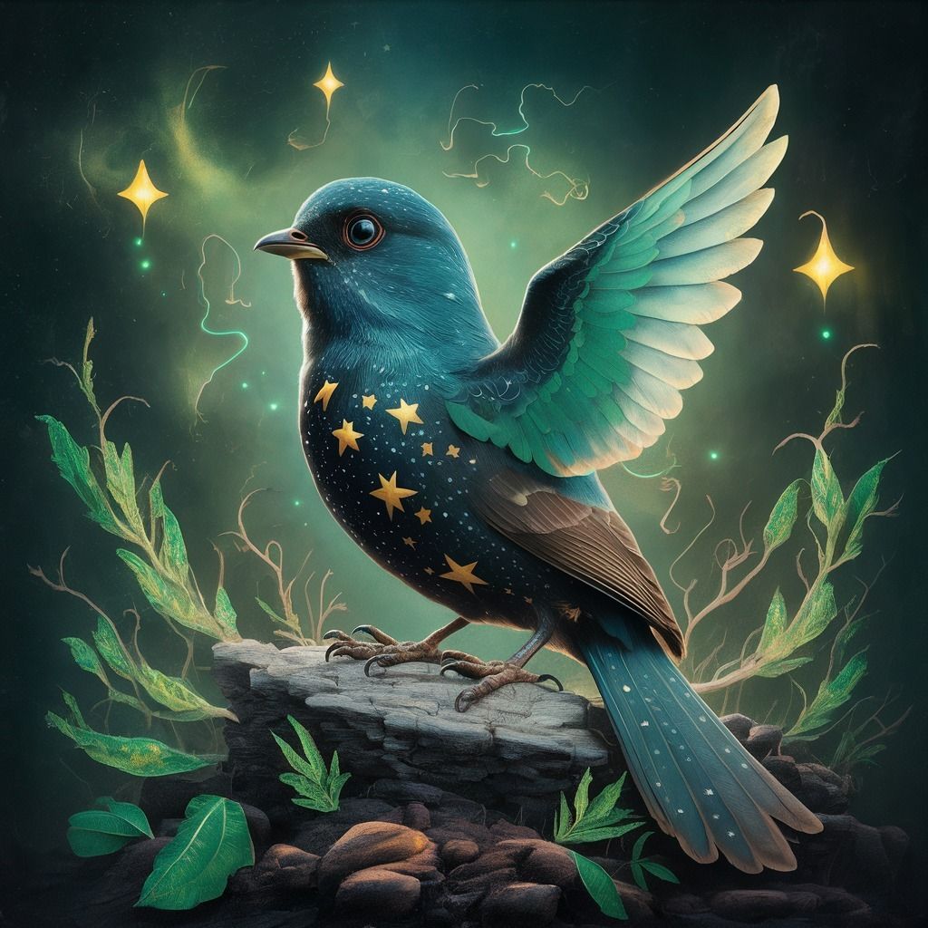 "a bird that has stars all over its body and wings that look lick the northern lights the size of a feanix"- RAISE YOUR VOICE -