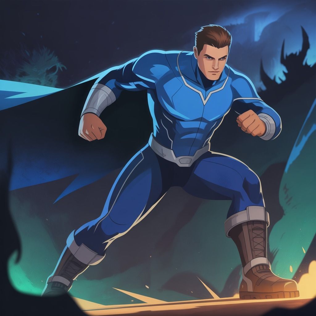 "A dynamic digital illustration of a heroic warrior in a vibrant blue, form-fitting costume, standing in an action pose with a determined expression. Surrounded by a dark, mysterious environment and shadowy monsters, dramatic lighting highlights his strength and confidence."Try this prompt in any decent AI image generator and let me know your result.