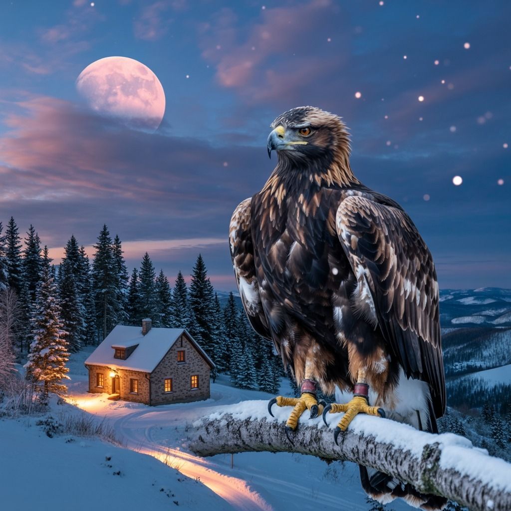 "A majestic eagle perched on a branch, overlooking a serene winter landscape. A quaint house with warm lights stands nestled among snow-covered pine trees. A winding path, illuminated by a fiery glow, leads to the house. The sky is painted in hues of deep blue and pink, with stars twinkling and a large, pink moon casting its glow. Snow-covered branches frame the scene, adding to the ethereal beauty of the setting."Try this prompt in any decent AI image generator and let me know your result.