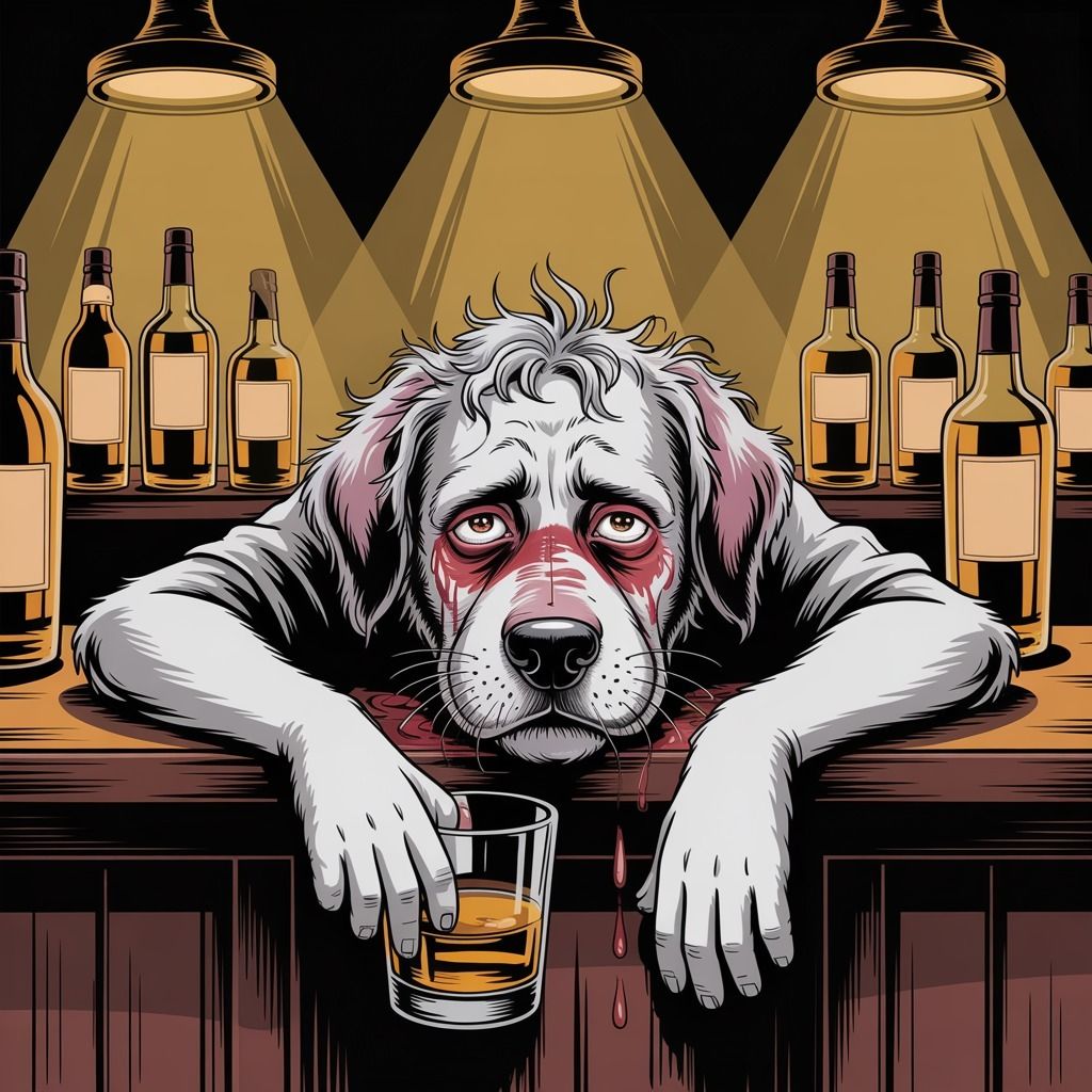 "A surreal illustration of a disheveled anthropomorphic dog slumped at a dim bar counter, bloodshot eyes and rumpled fur visible as he clutches an empty whiskey glass. Amber liquor bottles glow behind him in warm golden tones against deep shadows, while hazy overhead light creates a moody, expressionistic atmosphere symbolizing excess and its consequences."Try this prompt in any decent AI image generator and let me know your result.