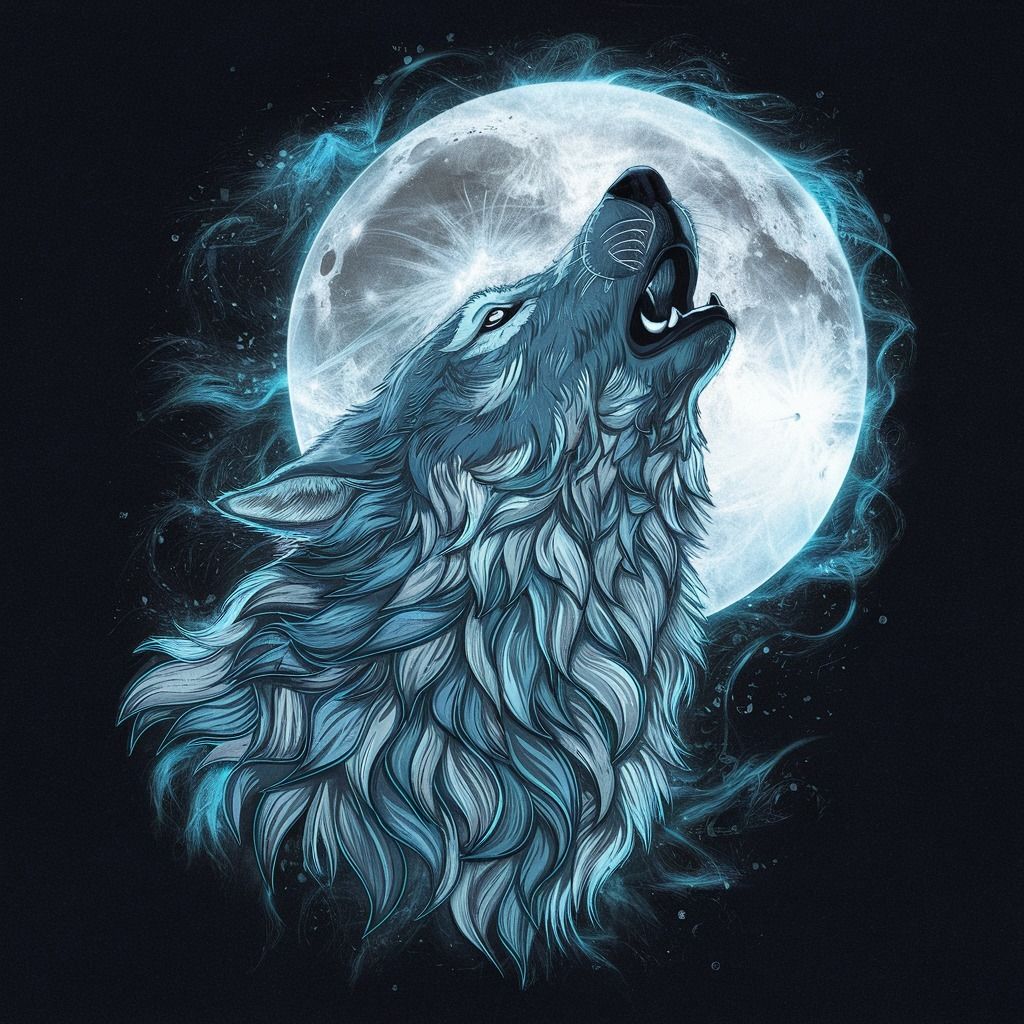 "A digital illustration of a mystical wolf howling at the moon, created in the detailed, ethereal style of fantasy wildlife art, with intricate fur patterns and a cool color palette of blues and silvers, resulting in a captivating design suitable for printing on the front of shirts. Pay attention to details and composition to ensure the final artwork is visually appealing and print-ready, ready to make a statement as wearable art or on household items., illustration, graffiti"- RAISE YOUR VOICE -