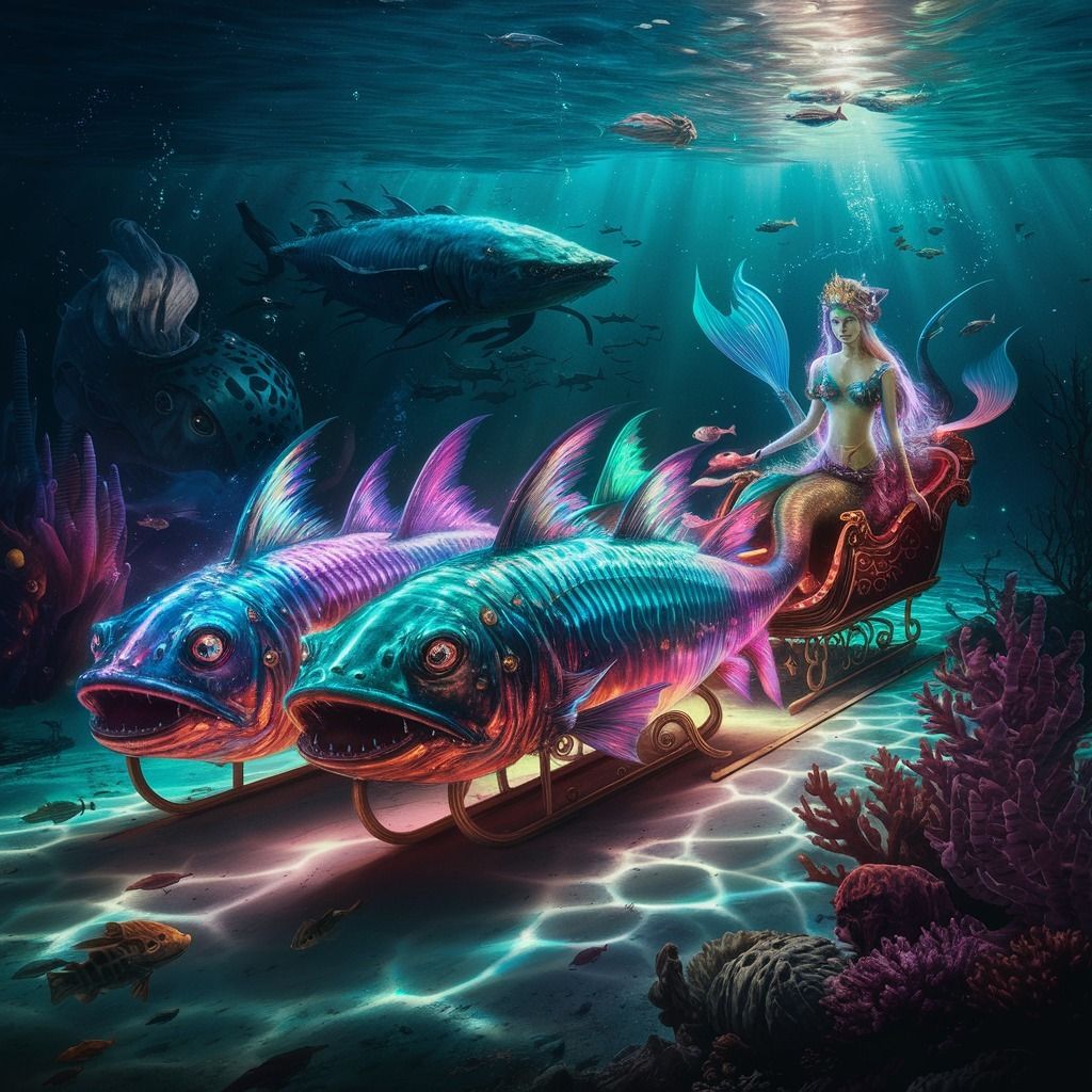"A realistic abstract mystical image of a group of piranhas with luminescent colored sheds pulling a sleigh with a mermaid princess through an underwater world. The background contains various underwater objects and creatures."Try this prompt in any decent AI image generator and let me know your result.