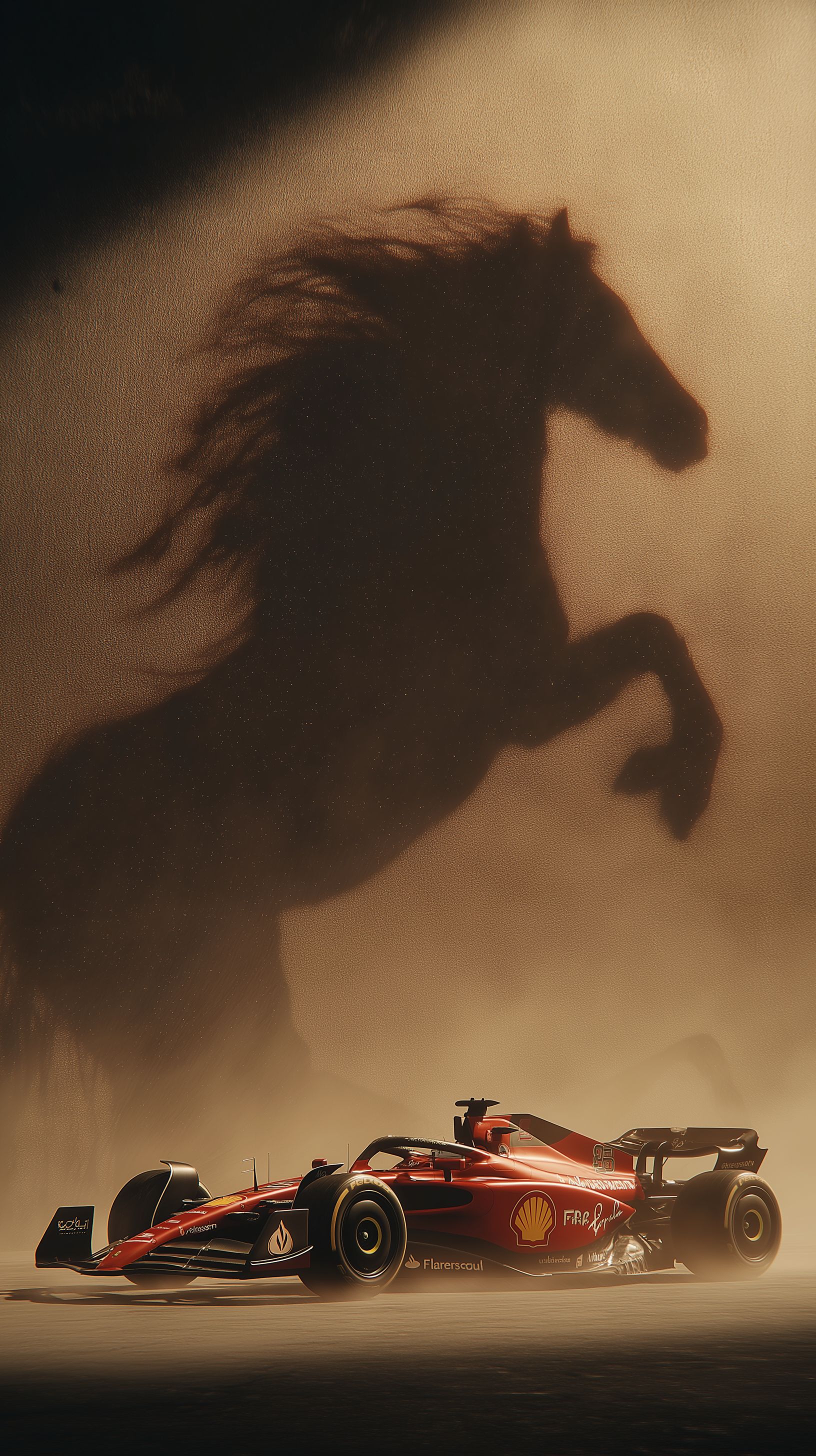 "A red Ferrari F2023 Formula One car, prancing horse logo gleaming on its side, tears through a cloud of golden dust. Behind it, a gaunt black stallion's shadow stretches across a crumbling wall, as if chasing the machine it inspired. Warm amber tones, dramatic cinematic lighting, ultra-realistic detail, high contrast, film grain."Try this prompt in any decent AI image generator and let me know your result.