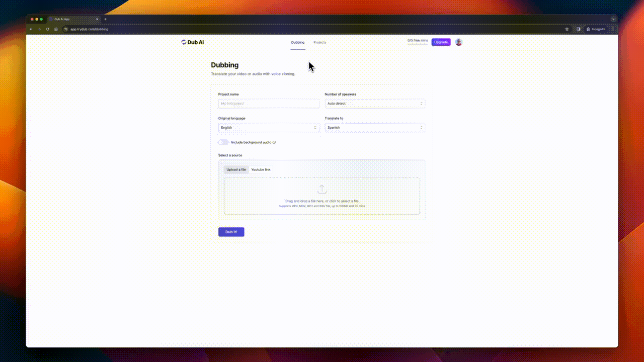 How it works: Simply upload an audio or video file or enter a YouTube URL, and Dub AI will handle the rest.