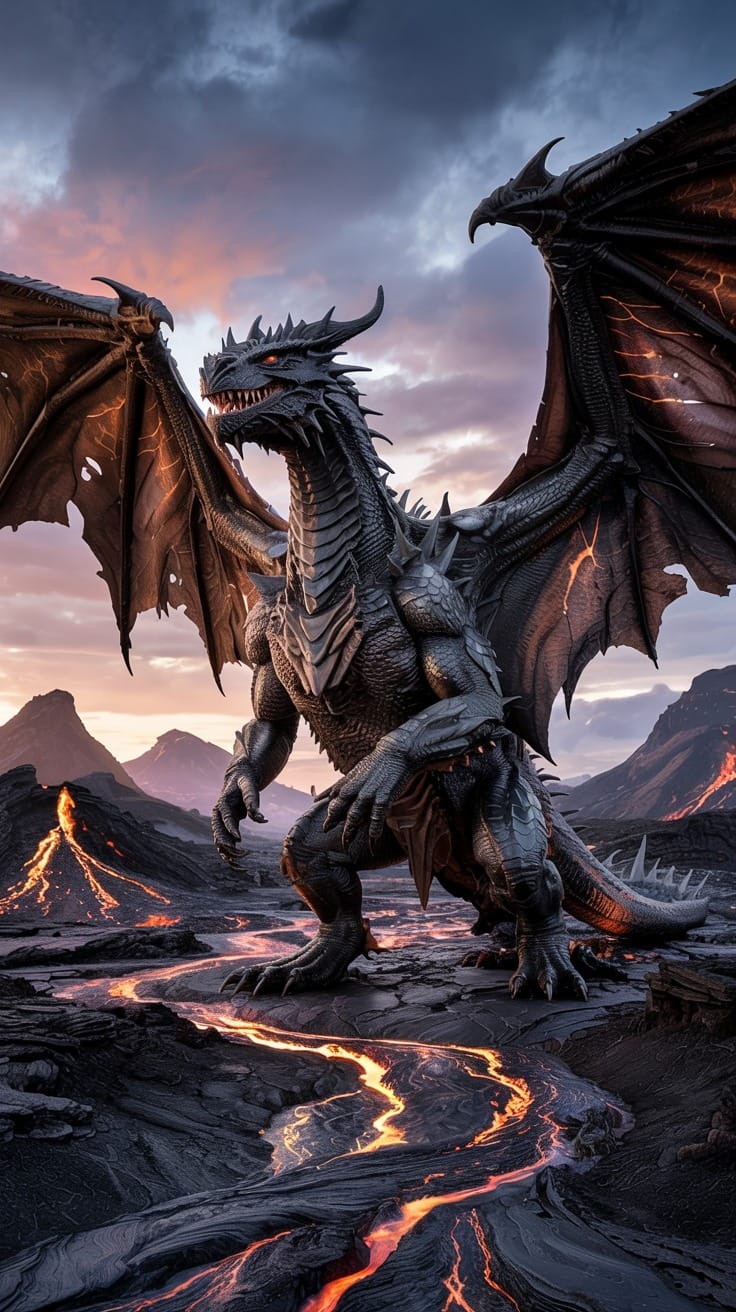 "A colossal Balerion hovers over a volcanic wasteland, his obsidian scales absorbing light and his crimson eyes blazing. His massive wings stretch across the horizon, glowing with orange-veined patterns. Below, molten lava winds through dark rock, casting long shadows under his fiery gaze."Try this prompt in any decent AI image generator and let me know your result.