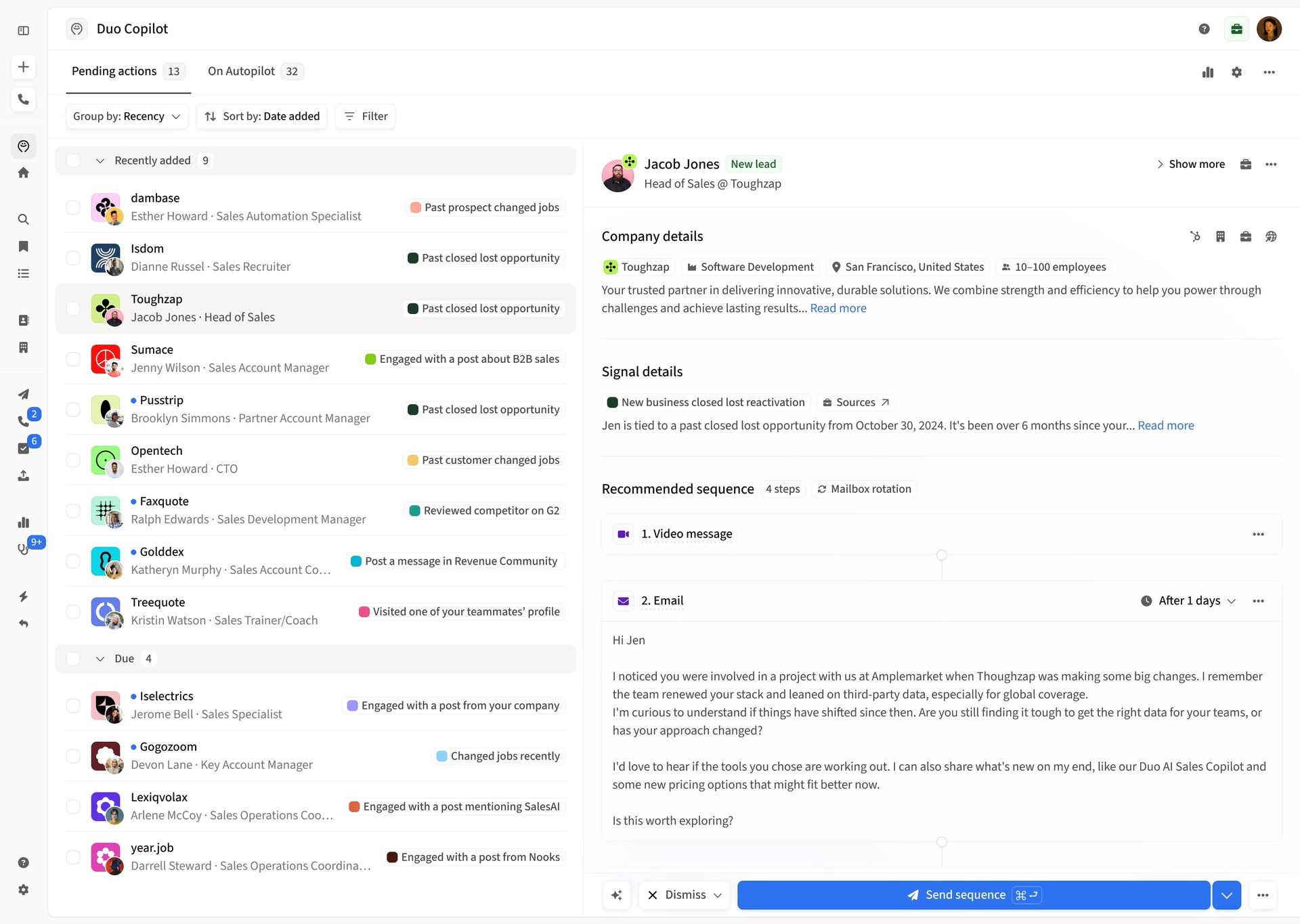 Use Duo AI Copilot: Get daily suggestions for prospects, personalized messaging, and follow-up reminders to save time.