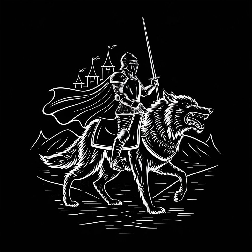 "A white-only medieval-inspired illustration of a valiant knight in full armor riding a large, majestic wolf. The knight holds a long lance upright, his cape flowing in the wind, while the wolf snarls fiercely, exuding power and loyalty. The background features faint castle spires and rolling hills, drawn in intricate yet clean linework. The design is centered and balanced, ensuring it seamlessly fits a t-shirt graphic on a plain black background."Try this prompt in “Ideogram” for FREE.