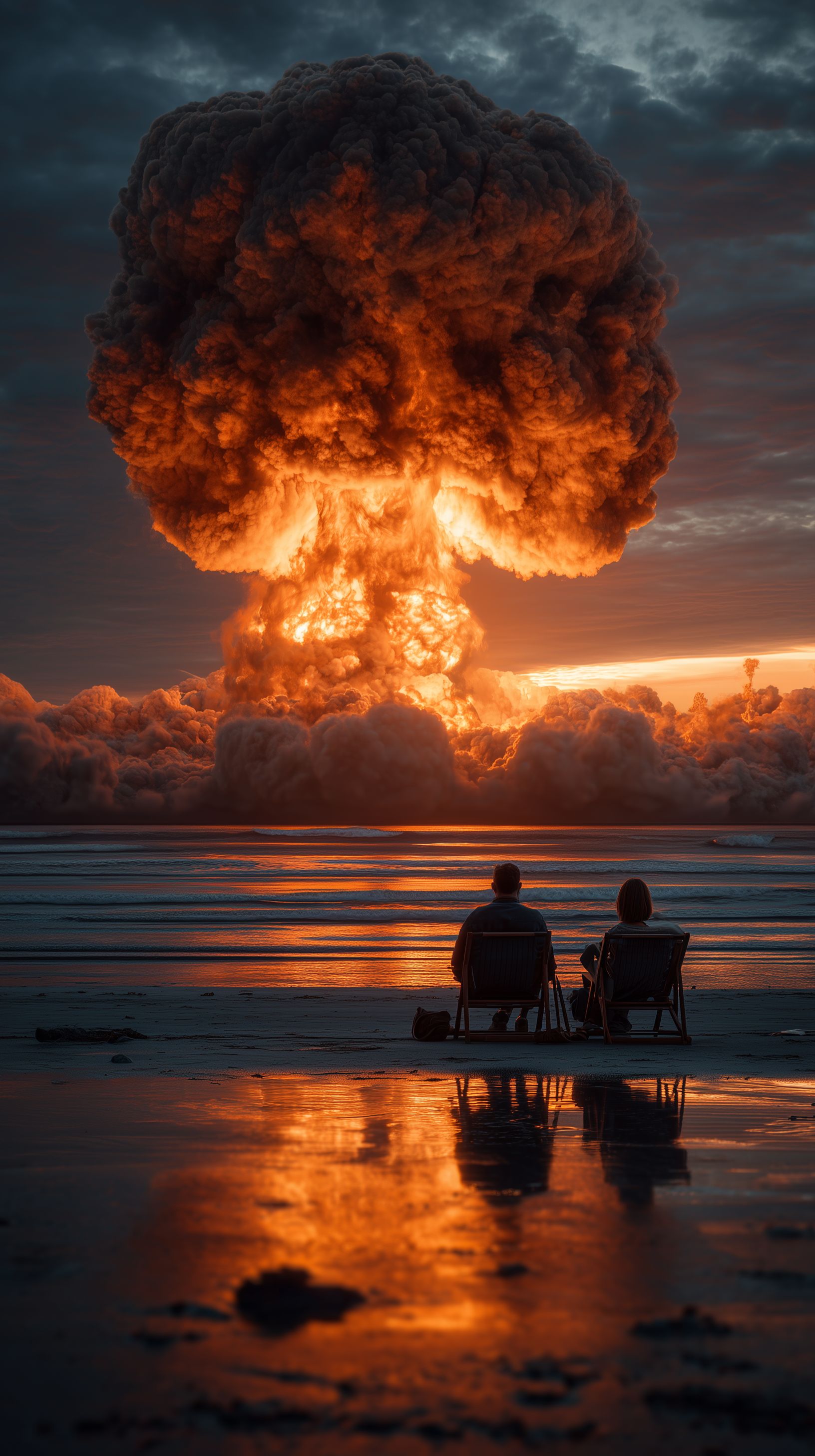 "A colossal nuclear explosion rises over the ocean horizon, towering mushroom cloud glowing in intense orange and gold, shockwave lighting the sky, fire reflecting on wet sand. In the foreground, a man and woman sit silently in beach chairs watching the blast, their silhouettes dark against the blazing light. Hyper-realistic cinematic photography, IMAX camera, volumetric lighting, deep contrast, epic disaster-film atmosphere."Try this prompt in any decent AI image generator and let me know your result.