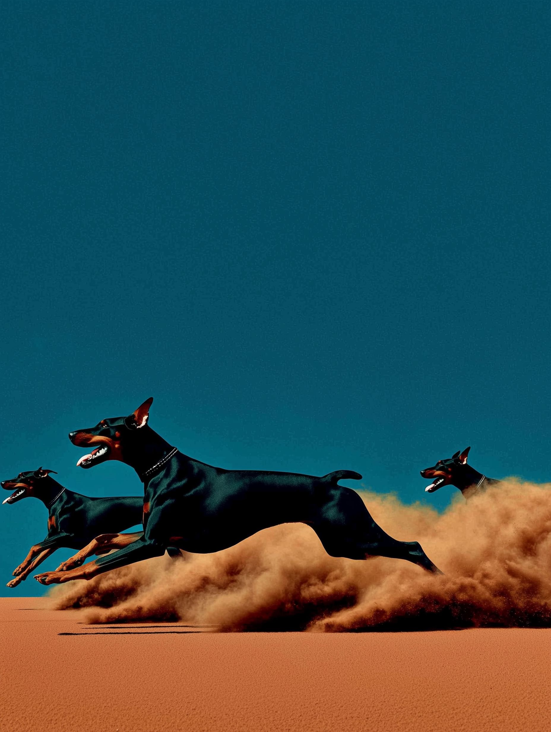 "Wide-angle heroic landscape of a lone black Doberman Pinscher leading two others, galloping across a colossal floating circular matte pink clay court resembling a sculpture, set against a vast solid yellow void sky. Trails of vibrant orange powder and white smoke follow them, with sharp architectural silhouettes, harsh sunlight, extreme scale, and a surreal minimalist dreamlike atmosphere."Try this prompt in any decent AI image generator and let me know your result.