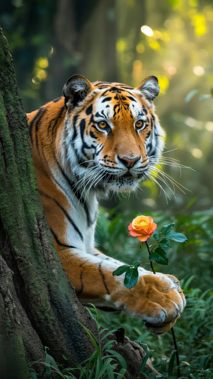 "Hyper-realistic cinematic photo of a majestic Bengal tiger peeking from behind a moss-covered tree trunk in a sun-drenched jungle, mouth slightly open, gently holding a vibrant orange rose in its paw. Intricate fur and whisker detail, sharp facial focus, soft bokeh forest background with golden sunlight filtering through leaves. National Geographic style, 8K, vivid colors."Try this prompt in any decent AI image generator and let me know your result.