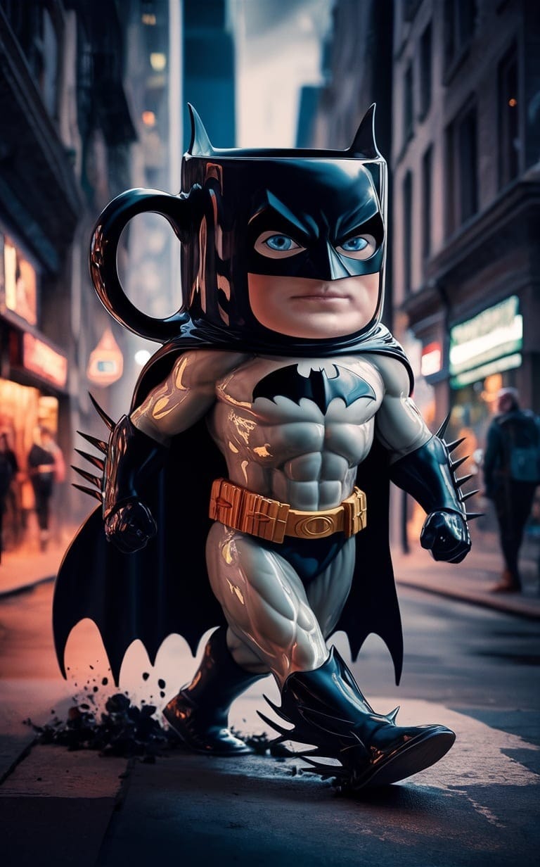 "A captivating illustration of Bat Mug, a unique fusion of Batman and a mug, standing tall amidst the bustling streets of Gotham City. The hero's powerful, muscular body is covered in a sleek, glossy ceramic exterior that resembles fine porcelain, with subtle mug-shaped accents. The iconic Batman suit has transformed into a shiny black exoskeleton, adorned with handle-shaped feet. The head is shaped like a mug, featuring deep blue eyes and a small, firm mouth. A proud black handle rises from the top of the head, giving the character a distinctive touch. Bat Mug moves gracefully through the city's urban landscape, casting a trail of shadowy intrigue behind it. The image is vibrant, with a mix of illustration, 3D render, and photography techniques., vibrant, photo"- RAISE YOUR VOICE -