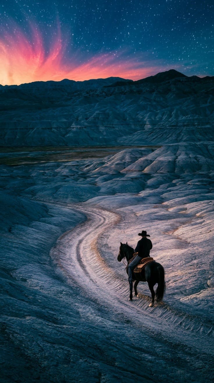 "Cowboy rides a black horse in silhouette against a vibrant, bleeding horizon. Ethereal, haunting lighting casts deep shadows, capturing the cinematic essence of the West. Ultra-realistic 16k photograph with high detail, depth of field, Kodak Portra 800, 105mm f1 lens, luminous aura, and glowing, fluid colors. Stunning texture and professional DSLR lighting enhance haunting beauty worthy of Storaro and Deakins."