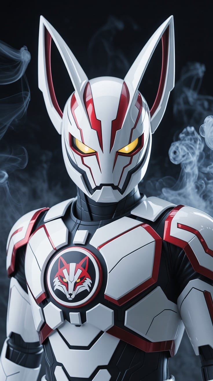 "A dramatic photo of a person in a white and red robotic superhero costume inspired by tokusatsu, featuring angular armor, glowing yellow cat-like eyes, and a helmet with pointed ears. Red accents outline the sharp-edged design, while a circular chest emblem displays a fierce fox head surrounded by intricate mechanical details. Swirling smoke and intense lighting highlight the glossy surfaces and the hero’s confident stance."Try this prompt in any decent AI image generator and let me know your result.