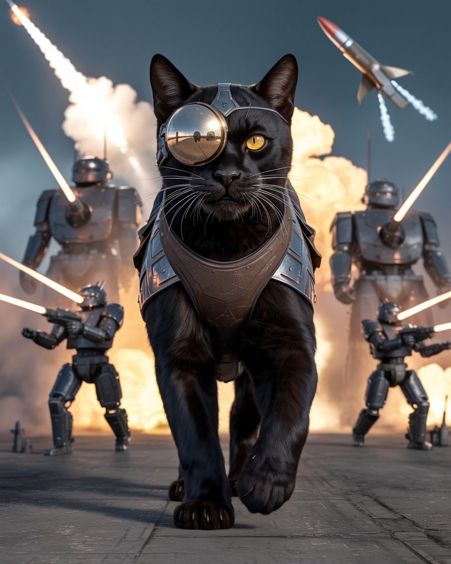 "A cinematic digital illustration of a massive armored Bombay cat, panther-sized, striding confidently toward the viewer with piercing yellow eyes. Its sleek black fur contrasts with ornate metallic armor and a tactical saddle. A brass monocle glints over one eye, adding steampunk flair. Behind it, war robots clash in a smoky, chaotic battlefield as a missile cuts through the stormy sky."Try this prompt in any decent AI image generator and let me know your result.
