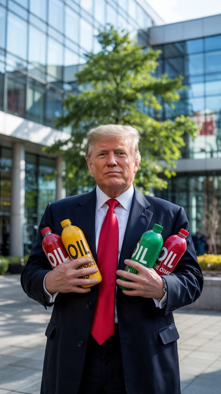 "Donald Trump stands confidently outdoors before a modern glass building reflecting bright sunlight. Dressed in a navy suit with a red tie, he holds four colorful plastic bottles labeled "OIL." Natural daylight casts sharp shadows, highlighting his suit and the glossy bottles, while a nearby oak tree adds a touch of elegance to the scene."Try this prompt in any decent AI image generator and let me know your result.
