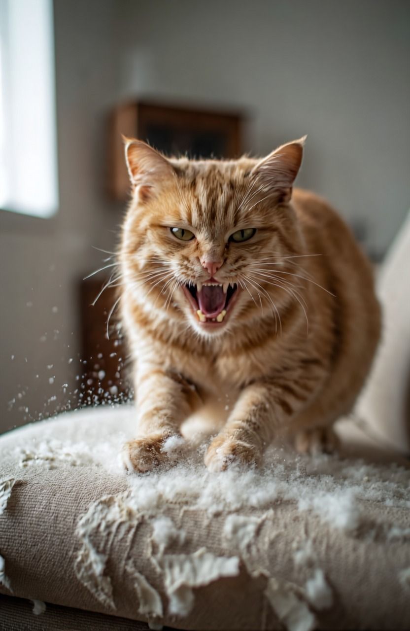 "A furious ginger tabby with thick fur snarls atop a beige couch, claws tearing into upholstery as white stuffing spills out. Natural light highlights dust motes above the shredded fabric. Its ears are pricked forward, body tense with aggression, while the blurred background of a wooden cabinet and neutral walls frames the raw domestic drama in sharp cinematic focus."Try this prompt in any decent AI image generator and let me know your result.