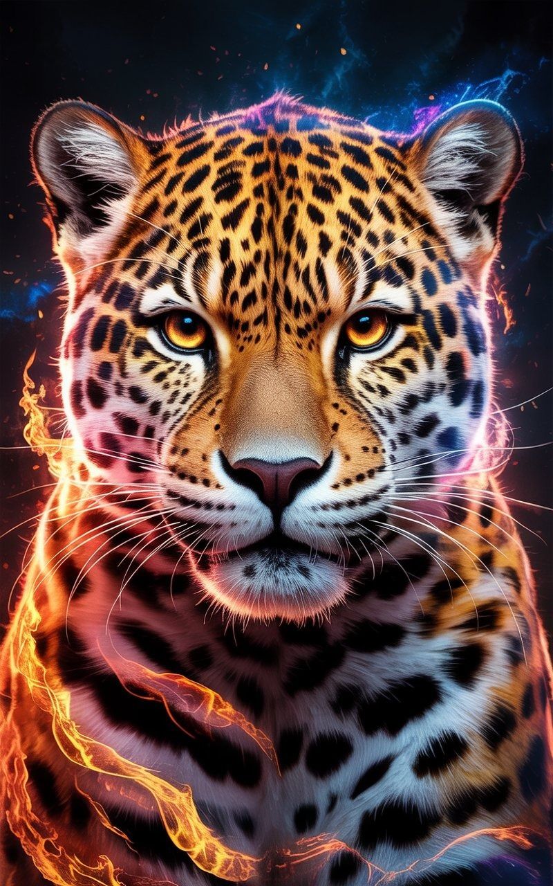 "A mystical feline face (jaguar or leopard) viewed from the front, hyper-detailed, fur made of swirling flames and cosmic energy in red, orange, yellow, blue, and purple, glowing golden amber eyes radiating power, dark background with sparks and cosmic accents, ultra-detailed digital fantasy painting, 8k resolution, cinematic dramatic lighting, symbol of wild strength and spiritual guardian."Try this prompt in any decent AI image generator and let me know your result.