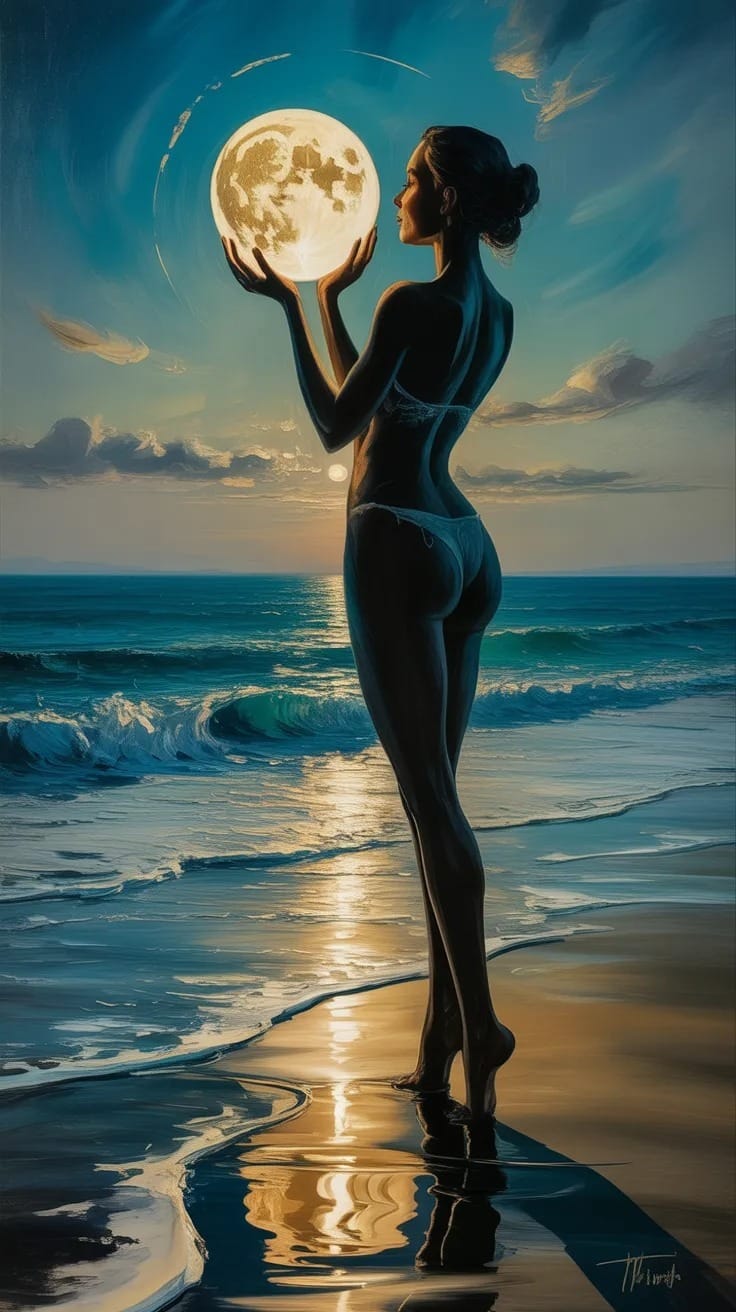 "Vertical abstract oil painting of a graceful silhouetted woman standing on a quiet shoreline, holding a glowing full moon in both hands as the sole light source. Moonlight ripples across the water before her. Subtle highlights define her curves. A serene ocean and softly brushed clouds stretch behind, with textured sand, gentle waves, layered colors, and rich impasto detail creating a calm, contemplative mood."Try this prompt in any decent AI image generator and let me know your result.